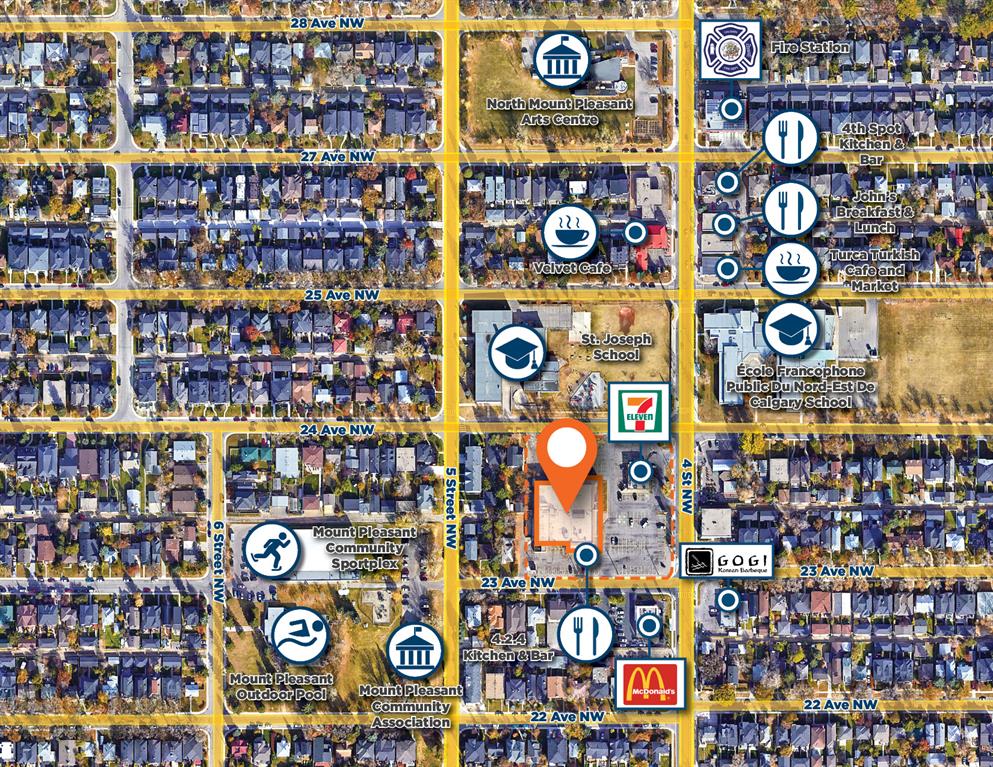 Show suite now available (Option A - 4,375 SF). 15,853 SF second floor office in centrally located northwest neighbourhood; located at Mount Pleasant. Multiple configurations available from 4,375 SF to 15,853 SF. Ample of free surface parking on site. Balcony access available for the front suites. Prominent signage exposure to 4th Street SE. Elevator and stair access to second floor. Commercial restaurant & bar on main floor. Also, child education facility on main floor. Walking distance to cafés/restaurants, sport complexes, and parks. Public transportation available on 4th Street NW, including bus routs #2 and #404. Close proximity to 16 Avenue NE and Centre Street. 5 minutes to Downtown Calgary, and 5 minutes to Deerfoot Trail SE via 16 Avenue NE.